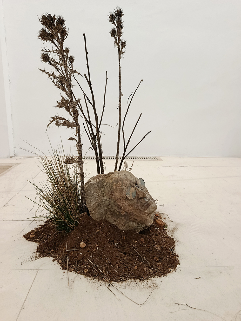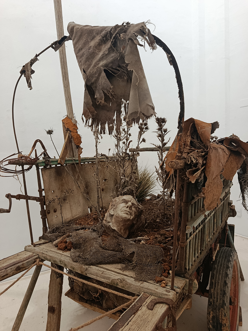 Sobrecogedoras realmente las obras tridimensionales de Serzo que se van a ver ahora en Cuenca. Especialmente impactante la instalación, como siempre con un punto a lo Kienholz, sí, titulada El mulo de Vallecas, sangrante autorretrato tirando de un carro cargado de elementos (incluida tierra y cardos recogidos en el Cerro Testigo) con denominación de origen en esos campos por los que ha caminado, en los que ha tomado fotografías, y videos.(…) “