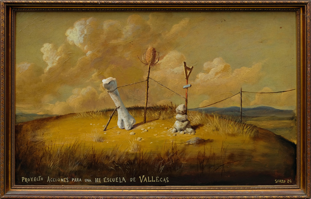 “ (…) La obra de José Luis Serzo es un viaje introspectivo que invita a una reflexión filosófica sobre el impacto de lo material en la construcción de la identidad. Su herencia manchega, en diálogo con la influencia de la Escuela de Vallecas, ofrece un campo fértil para explorar las complejidades de la existencia humana, revelando cómo la realidad material moldea nuestras narrativas y, a su vez, nos aporta una comprensión más profunda de nosotros mismos en un contexto que busca una reterritorialización en un mundo en constante movimiento. Partiendo de las reliquias de las Escuelas vallecanas, que simbolizan elementos tangibles que surgen de relatos pasados, como objetos culturales, obras de arte o vestigios históricos, que conservan la memoria y la identidad del grupo, Serzo nos presenta una nueva narrativa construida para dar sentido a su existencia, integrando creencias, tradiciones y valores que, aunque pueden parecer inmateriales, tienen base en condiciones materiales concretas. Urdimbre efectiva para la fundación de una nueva Escuela. El renacer de la III Escuela de Vallecas en la pregnancia del espíritu de las anteriores. Sobre las reliquias/restos de la España decadente de la preguerra civil, la primera Escuela intenta construir un relato de vanguardia y modernidad. Sobre aquel “Castilla miserable, ayer dominadora, envuelta en sus harapos, desprecia cuanto ignora” tratan de reescribir, a través de su pintura y escultura, un resurgir de la dignidad y gallardía del Arte, cual Ave Fénix que renace victorioso de sus cenizas.(…) “