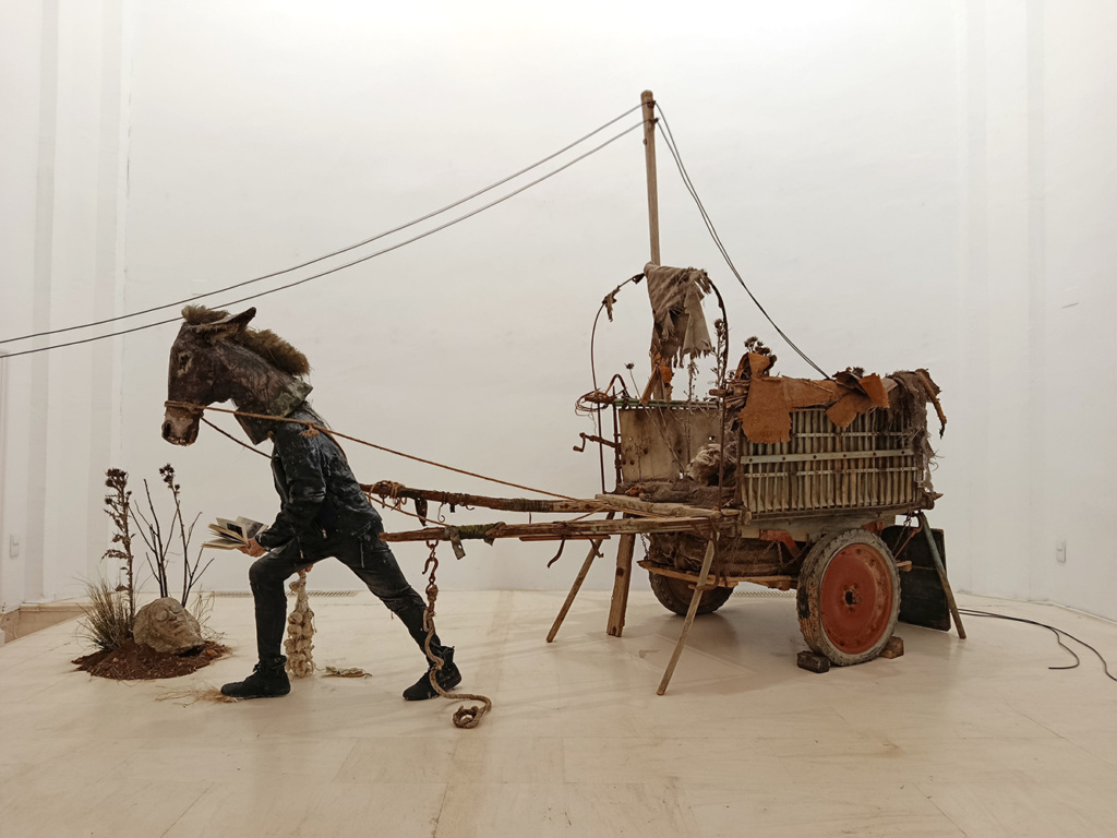 Sobrecogedoras realmente las obras tridimensionales de Serzo que se van a ver ahora en Cuenca. Especialmente impactante la instalación, como siempre con un punto a lo Kienholz, sí, titulada El mulo de Vallecas, sangrante autorretrato tirando de un carro cargado de elementos (incluida tierra y cardos recogidos en el Cerro Testigo) con denominación de origen en esos campos por los que ha caminado, en los que ha tomado fotografías, y videos.(…) “